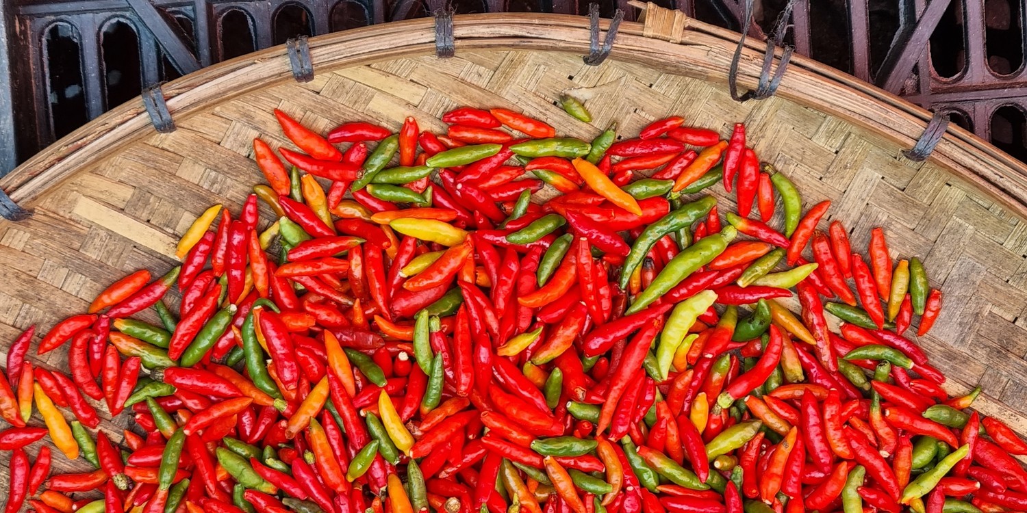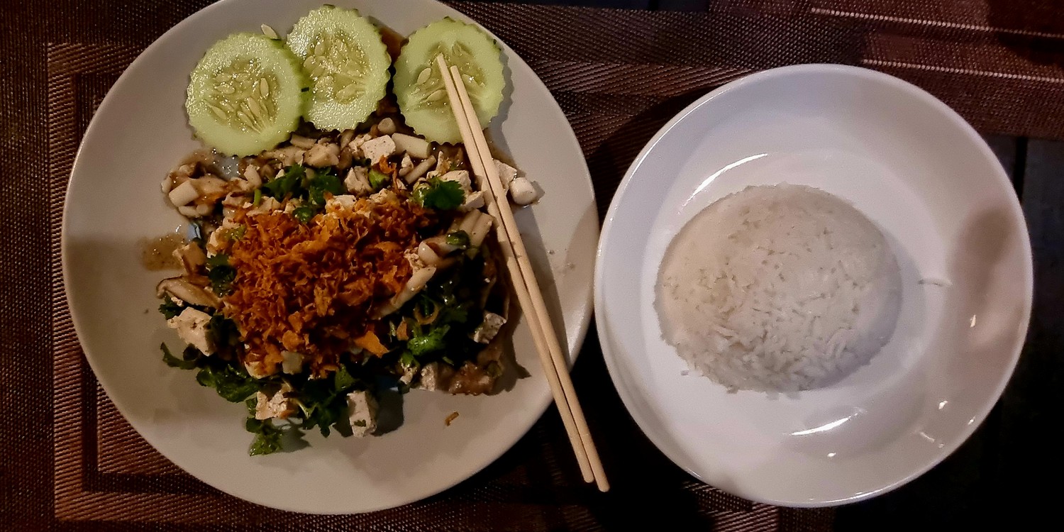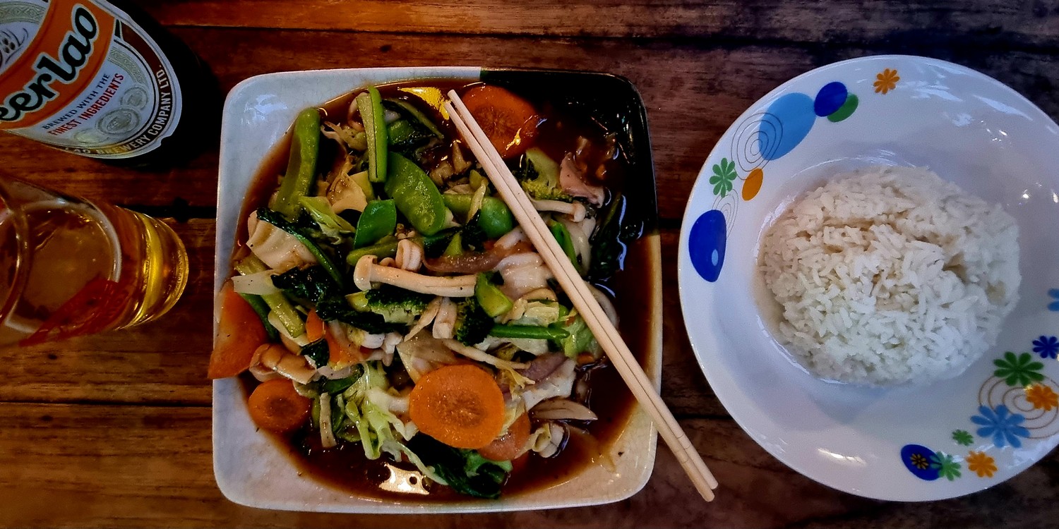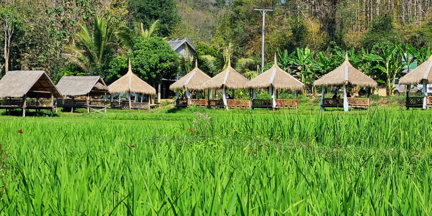 Puis nous ferons une halte vraiment cool sur une terrasse en bambou donnant sur les rizières pour un encas salade varié avec un shake coco,