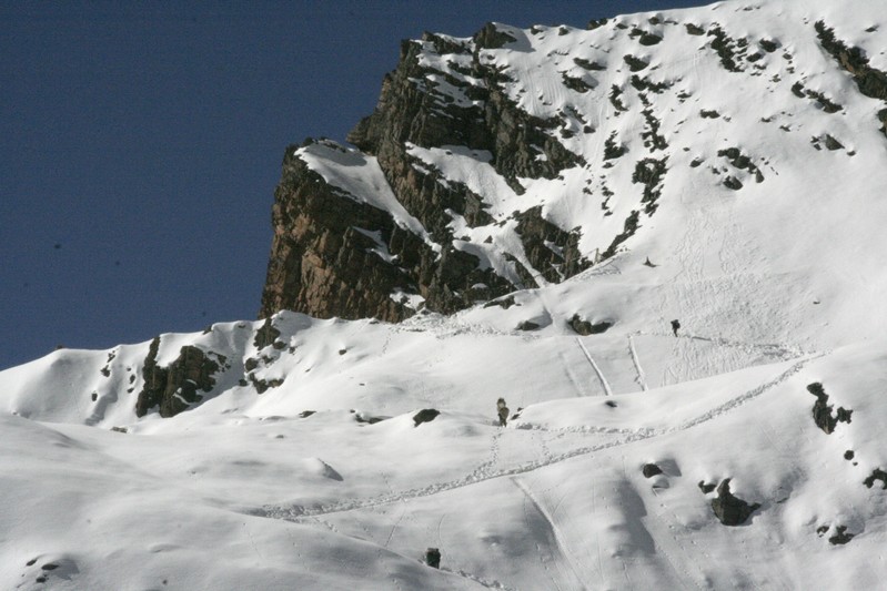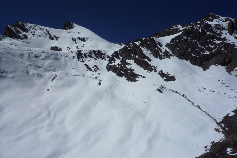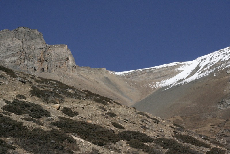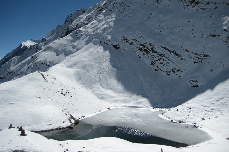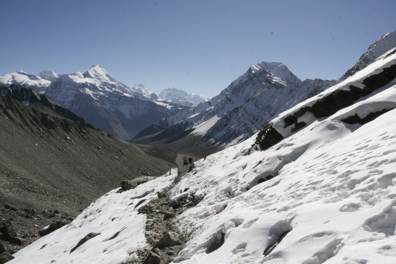 Premier arrêt bref à Kangla Pedi (4530 m) puis je pars devant et j'attaque la longue montée vers le col dans la glace et la neige abondante.