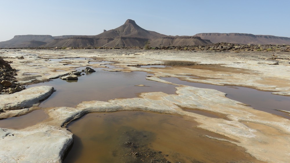 Notre itinéraire suit les méandres d'une large rivière blanche asséchée dans laquelle les dernières chutes de pluie ont laissé quelques flaques d'eau et créer un puit d'eau douce. Les couleurs sont magiques et les contrastes nombreux. Les collines rocheuses brunes qui l'entourent offrent un décor de cinéma fantastique et malgré toute cette roche, un peu d'eau suffit pour que la vie l'emporte. Les acacias et les fleurs nous regardent, les animaux rampants ne manquent pas, les chèvres en liberté non plus..