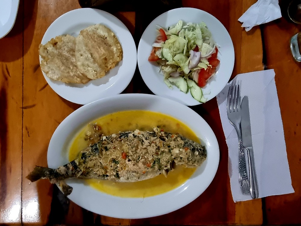 le village et manger un très bon poisson frais sauce coco, le mailleur pour moi, chez Pola.
